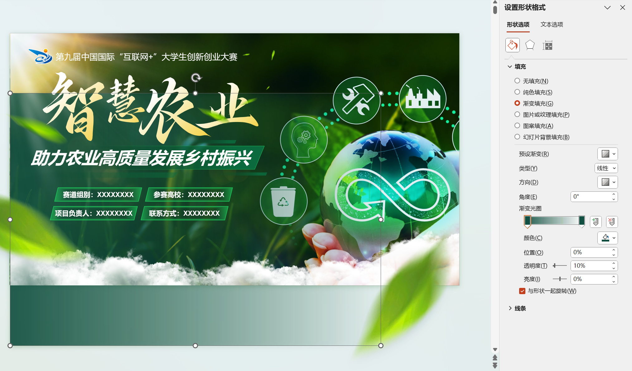 对于标题页/结尾页,大多数评委老师都喜欢看“高端大气上档次”的玩意,无论是什么类型的 PPT,都希望看到毛笔字/艺术字标题以及一个带一些渐变的背景,尽管我个人不喜欢这样的风格: